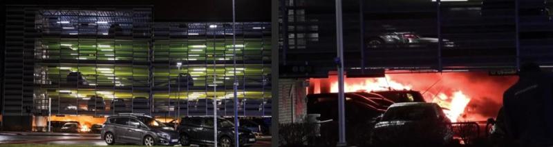 A becslések alapján a tűzben legalább háromszáz autó vált a lángok martalékává. A híradások szerint egy Opel Zafira volt a tűz kiindulópontja; bár a tüzet azonnal észlelték, esély sem volt a továbbterjedés megakadályozására. A zárt térben bekövetkezett tüzeknél a második jármű kigyulladása akár egy perc alatt is megtörténhet; aztán az újabb és újabb járművek kigyulladása fordított arányosságban (exponenciális mértékben) hat a továbbterjedés idejére. A mennyezet miatt a klasszikus nyílt téri tűz nem tudott kialakulni; egy olyan, felülről és egyik oldalról behatárolt tűz alakult ki, ahol a szél által hajtott lángok és a hő csak oldalra tudott terjedni.