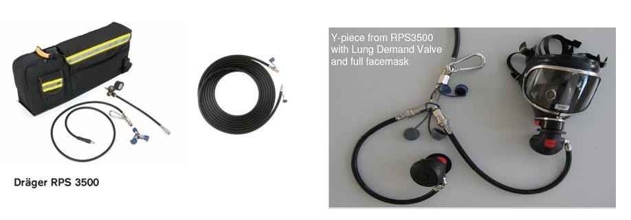 Megoldás III. Tűzoltók számára kifejlesztett mentőcsomag (Rescue Pack System 3500) alkalmazása. A használatban lévő 6 liter / 300 bar acél palackot vagy a 6,8 liter / 300 bar kompozitpalackot teszük bele az RPS 3500 hordtáskájába és csatlakoztatjuk az RPS 3500 nyomáscsökkentőjére, ehhez a 3-tól 45 méter tömlőt csatlakoztathatunk, majd a speciális középnyomású tömlő karabinerrel, ehhez kapcsolódik a megszokott tüdőatomata és álarc. Előny, hogy a palack, tüdőautomata és álarc az egységeknél rendelkezésre áll.
